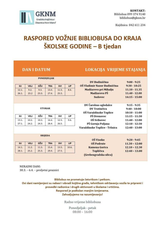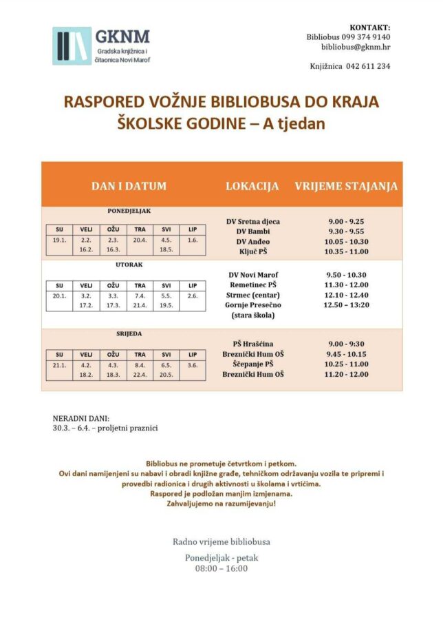 Dragi korisnici, obavještavamo vas da bibliobus ponovno kreće s redovitim obilascima nakon zimskih praznika.